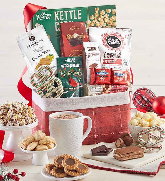 With its classic plaid design and festive bow, this basket of holiday treats instantly feels cozy and welcoming. Inside are a bounty of equally inviting indulgent treats including two kinds of premium popcorn, lemon cookie bites, milk chocolate truffles, a white chocolate-covered pretzel, and decadent double chocolate hot chocolate mix. These goodies would be great for sharing with friends and family during the holidays or giving as a gift full of fun and flavorful fare.
