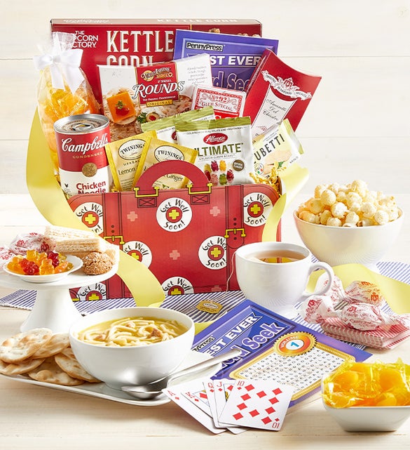 Doctors don’t make house calls anymore, but we do! Send a friend who’s on the mend this adorable doctor’s bag full of tasteful remedies for whatever ails them. They’ll love the get well fast, too cute "prescription Rx" cookie, tried and true Campbell’s® Chicken Noodle Soup, delicious Harry & David® Shortbread Cookies, soothing Twinings® Lemon & Ginger Tea, sweet chocolate wafer bites, a word seek activity book and more!