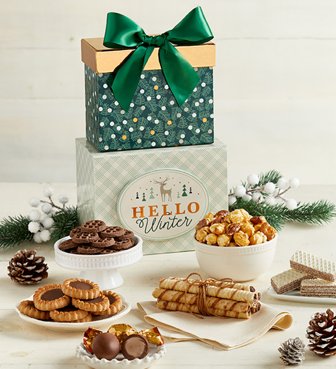 Make spirits bright this holiday season with a stunning two-box tower full of tasty snacks and treats. Each box is uniquely decorated with its own festive design, but the goodies within are what make it truly special. Share delights like milk chocolate truffles, hazelnut rolled wafers, mini cocoa waffle cookies, Harry & David® Moose Munch® classic caramel popcorn mix, and much, much more. Topped with an ivory bow for a sweet finishing touch.
