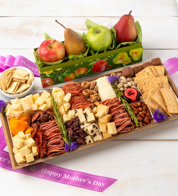 A beautifully curated board created to celebrate and spoil Mom. This ready-to-serve arrangement features artisan cheeses like creamy Havarti, aged Toma Reserve, and blueberry Stilton, perfectly paired with savory salami, olive oil crackers, and a touch of sweetness from Mediterranean apricots and fresh fruit. Thoughtfully arranged on a reusable wooden tray, it’s an effortless and heartfelt way to show appreciation and make her day extra special.