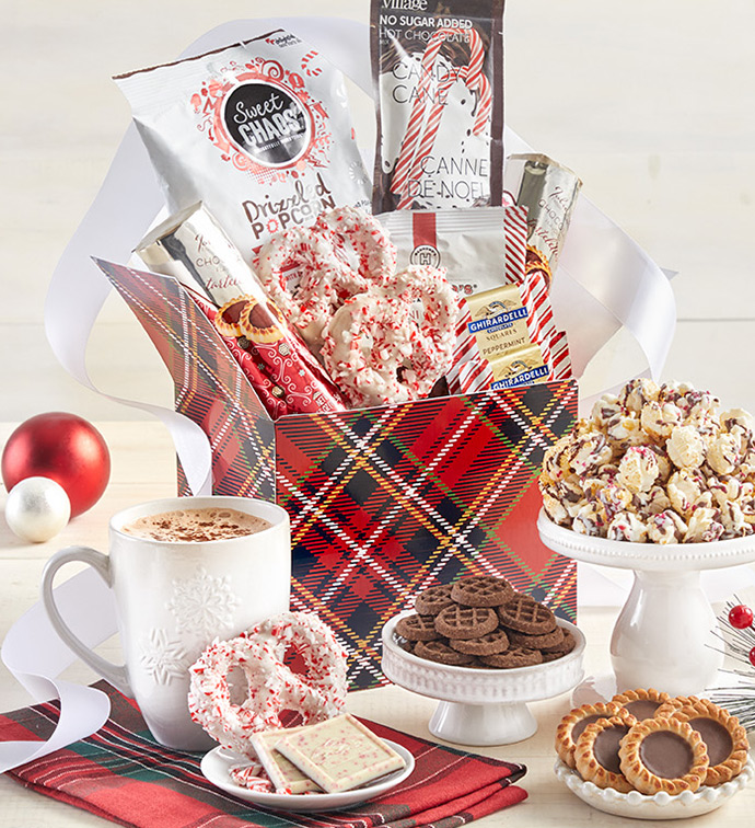 Send tidings of comfort and joy across the miles with a lovely gourmet gift. This box is brimming with an array of seasonal goodies, including chocolate tartlets, mini cocoa waffle cookies, Sweet Chaos® peppermint crunch popcorn, candy cane-flavored hot chocolate mix, white chocolate-covered pretzels topped with crushed peppermint, and Ghirardelli® dark chocolate peppermint bark squares. Decorated in traditional Christmas plaid and topped with a bow, this delightful gift will touch their hearts the moment it lands on the doorstep.